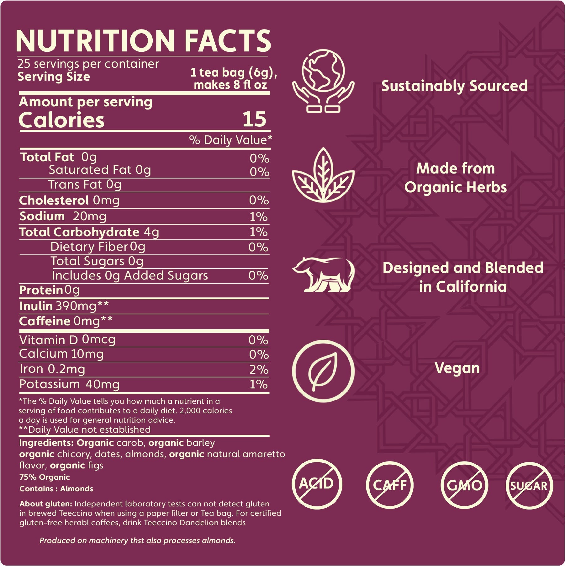 A sensory indulgence of roasted chicory over golden roasted almonds with hints of cherry and apricot. Subtly sweetened with dates and figs.