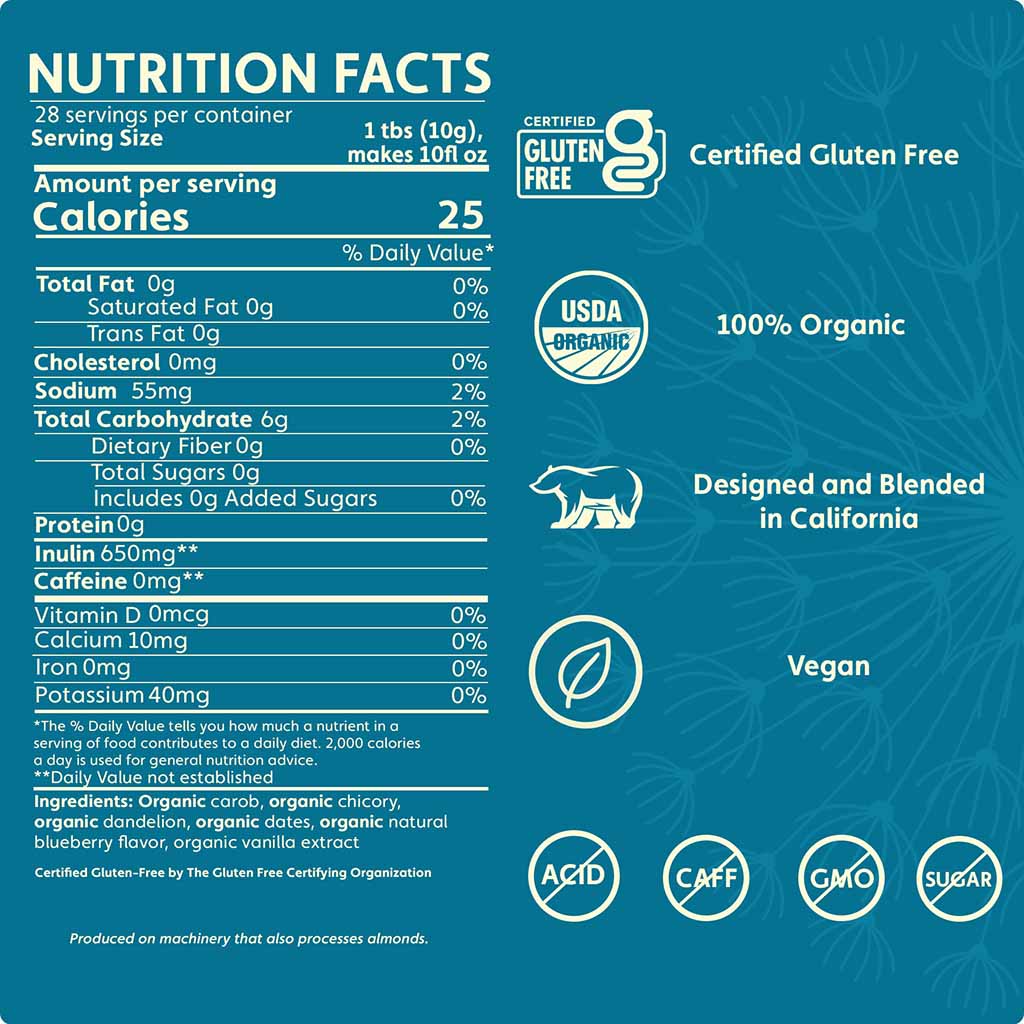 Vibrant blueberry cloaked in a dark roasted body of chicory with creamy organic vanilla extract softening the bitter edginess of dandelion root. If you like the combo of berries against deep richness, you’ll love sipping this blend that is reminiscent of dark chocolate blended with blueberries.