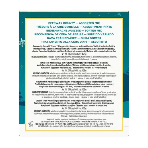 Beeswax Lip Balm: cera alba1, cocos nucifera oil, helianthus annuus seed oil, mentha piperita oil, lanolin, tocopherol, rosmarinus officinalis leaf extract, glycine soja oil, canola oil, limonene, linalool, eugenol 1. beeswax Vanilla Bean Lip Balm: helianthus annuus seed oil, cocos nucifera oil, cera alba1, aroma2, ricinus communis seed oil, lanolin, butyrospermum parkii butter, theobroma cacao seed butter, vanilla tahitensis fruit extract, vanilla planifolia fruit extract, ammonium glycyrrhizate, tocopherol, glycine soja oil, rosmarinus officinalis leaf extract, canola oil 1. beeswax 2. natural flavor / arĂ´me naturel Cucumber Mint Lip Balm: helianthus annuus seed oil, cocos nucifera oil, cera alba1, ricinus communis seed oil, aroma2, lanolin, cucumis sativus fruit extract, mentha viridis leaf extract, mentha piperita oil, theobroma cacao seed butter, butyrospermum parkii butter, carthamus tinctorius seed oil, glycine soja oil, tocopherol, rebaudioside A, limonene, linalool 1. beeswax 2. natural flavor / arĂ´me naturel Coconut and Pear Lip Balm: helianthus annuus seed oil, cocos nucifera oil, cera alba1, aroma2, ricinus communis seed oil, butyrospermum parkii butter, lanolin, pyrus communis fruit extract, ammonium glycyrrhizate, tocopherol, glycine soja oil, rosmarinus officinalis leaf extract, canola oil, limonene, linalool 1. beeswax 2. natural flavor / arĂ´me naturel