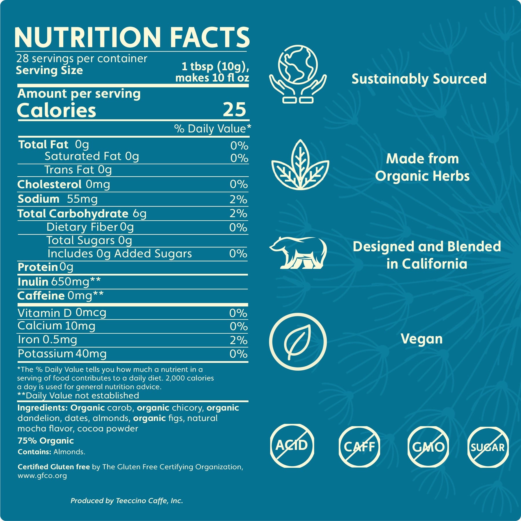 Lush chocolate meets the essence of coffee from roasted dandelion and chicory roots with a hint of sweetness from dates & figs.
