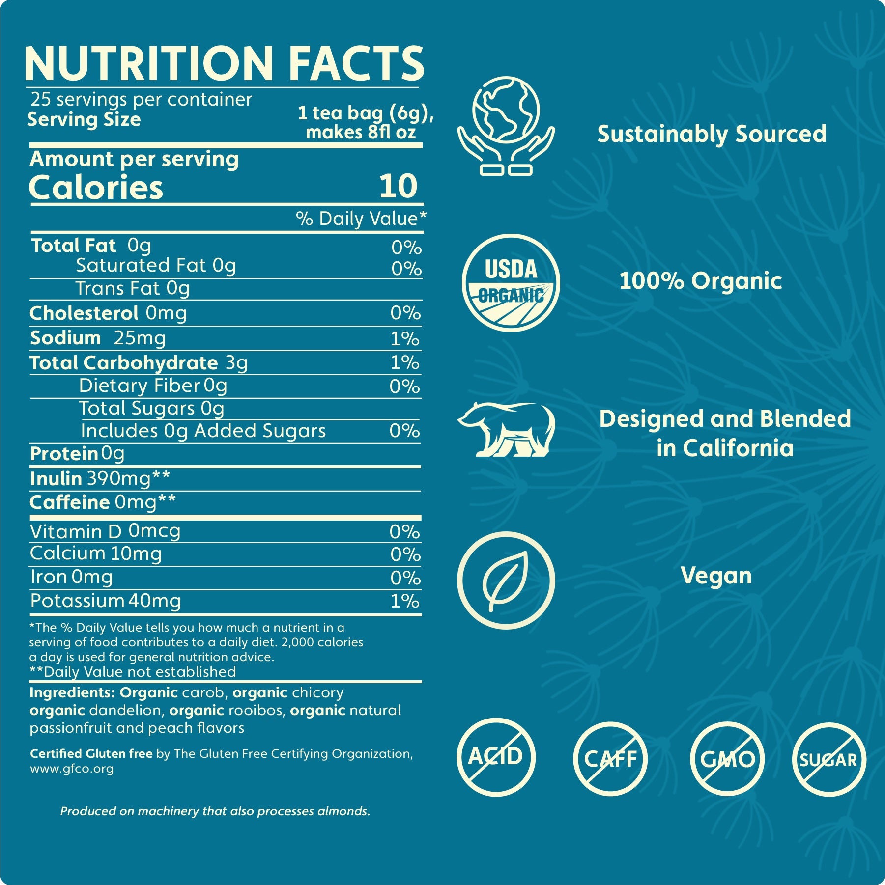 Luscious passionfruit and juicy peach bring their bright, fruity notes to red rooibos with depth from roasted dandelion and chicory.