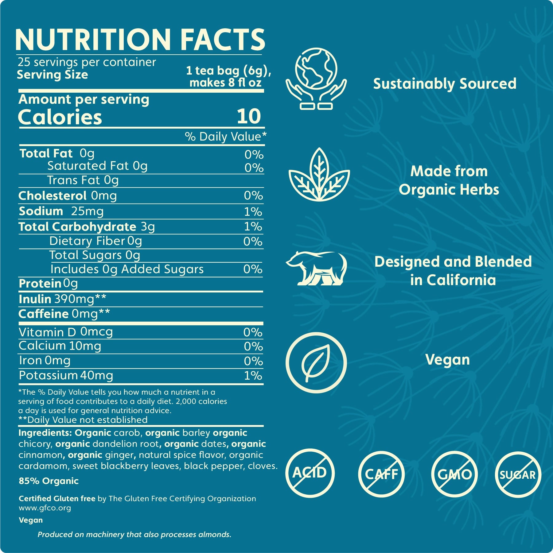 Red rooibos accented by uplifting ginger, cinnamon, cardamom, black pepper and cloves; uniquely paired with roasted dandelion and chicory roots.