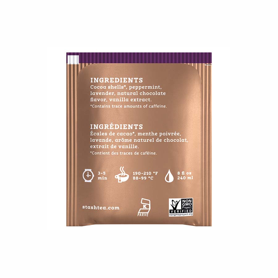 This unique herbal tea blends chocolate flavors with aromatic lavender and cool peppermint for a sophisticated cup. Add a touch of sugar and a splash of milk for a delightful dessert tea.