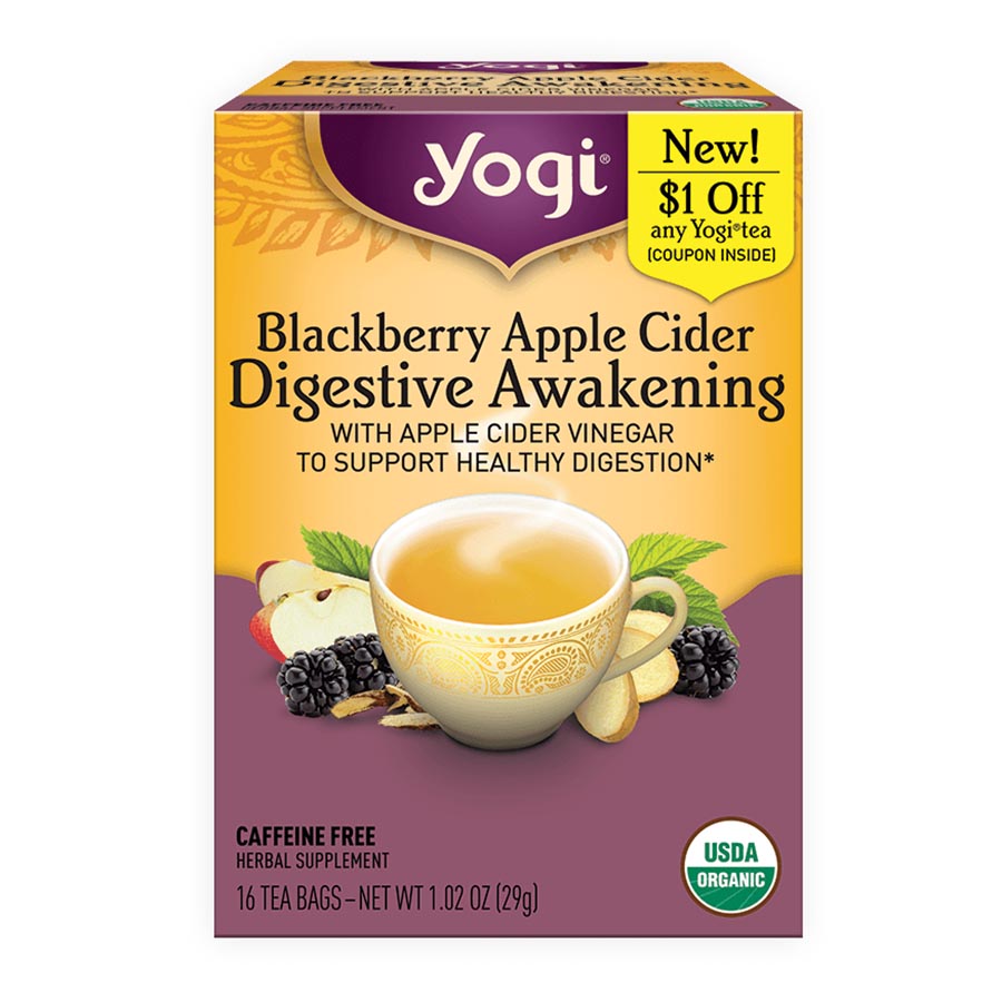 Energize your digestive system with Yogi Blackberry Apple Cider Digestive Awakening tea. Tart Apple Cider Vinegar, popularly used to wake up the digestive system, pairs with naturally warming Ginger, used for centuries in Ayurveda to help support healthy digestion. Blackberry flavor is added to impart bright and fruity notes to this delicious, caffeine-free tea. Begin each day with a tasty cup of Yogi Blackberry Apple Cider Digestive Awakening tea to help support healthy digestion